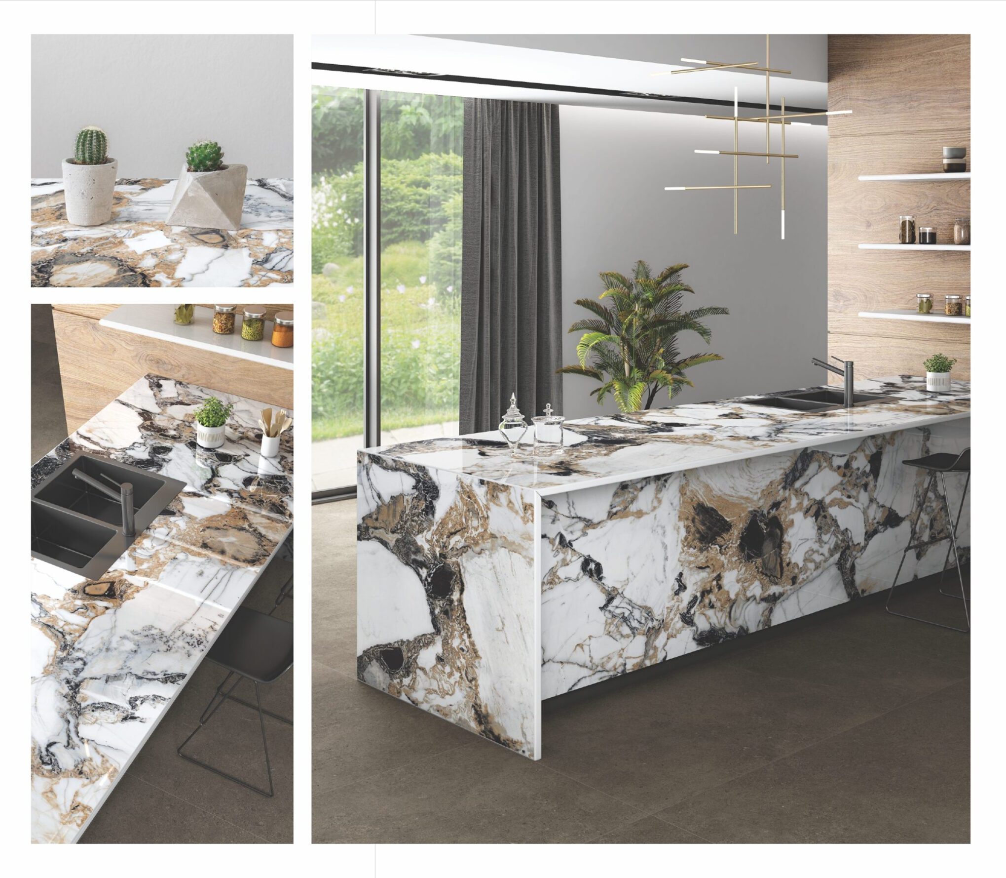 • Geometric Patterns: Experiment with porcelain slabs featuring bold geometric patterns for backsplashes and accent walls to add visual interest and personality to the room.